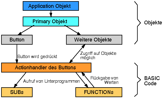Solange nichts passiert ist das Programm im Wartezustand. Wenn der Nutzer nun zum Beispiel einen Button anklickt, so ruft dieser seinen Actionhandler auf. Dieser Handler kann wiederum andere Subs oder Functions aufrufen. Außerdem kann er auf die Daten der anderen Objekte des Programms zugreifen, diese lesen oder verändern. Natürlich kann er auch Grafiken ausgeben oder auf Dateien zugreifen. Auf diese Weise wird die Funktionalität des Programms implementiert. Nachdem der Code des Actionhandlers abgearbeitet ist geht das Programm wieder in den Wartezustand über. ... Bis der Nutzer die nächste Aktion macht und der nächste Actionhandler aufgerufen wird.