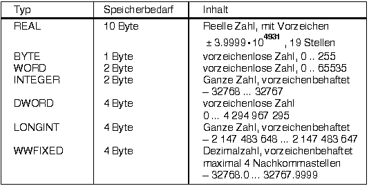 RealvariablenRealvariablen (real = reelle Zahlen) speichern Zahlen im Bereich von ± 3.9999*104931 mit einer Genauigkeit von 19 Stellen. Zahlen mit negativen Exponenten sind bis ± 10-4931 erlaubt.Byte, Word, Integer, DWord und Longint VariablenFür Einsteiger in die Programmierung ist der Zahlentyp REAL völlig ausreichend. Fortgeschrittene Programmierer würden jedoch bald die in der Computertechnik üblichen "kleinen" Zahlentypen vermissen. R-BASIC unterstützt daher zusätzlich die in der Tabelle angegebenen Typen. Sie benötigen auch wesentlich weniger Speicherplatz als Realvariablen.WWFixed VariablenBerechnungen mit dem Datentyp WWFixed werden merklich schneller ausgeführt als mit den anderen numerischen Datentypen. Die begrenzte Genauigkeit von 4 Nachkommastellen ist für viele Anwendungszwecke, insbesondere bei der Ausgabe von Grafik, völlig ausreichend. Damit R-BASIC mit WWFixed-Werten rechnet sind besondere Regeln einzuhalten. Diese sind im Kapitel 2.3.6 (Schnelle Mathematik mit WWFixed) beschrieben. Sie sollten dieses Kapitel unbedingt lesen, bevor Sie den Datentyp WWFixed verwenden!Beispiele: |