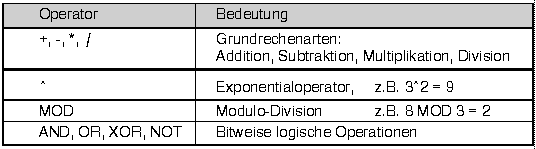 <VariablenTyp> ^2.2.2 Numerische Datentypen und numerische AusdrückeDie Verarbeitung von Zahlen und mathematischen Funktionen gehört zu den Kernaufgaben einer Programmiersprache. Numerische Variablen speichern Zahlen. In R-BASIC stehen die folgenden Typen zur Verfügung: