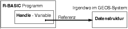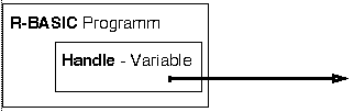 Bild: Das Handle wurde freigegeben, die Referenz ist noch vorhanden, aber ungültig. Nachdem das Handle freigegeben wurde (im Beispiel mit FileFindDone) kann die Variable sofort für andere Zwecke wieder verwendet werden. Das Konzept der Handles ist dem des Datentyps FILE analog. Auch hier werden R-BASIC-intern Daten angelegt (FileOpen), verwendet (FileRead bzw. FileWrite) und wieder freigegeben (FileClose). NullHandleNullHandle( ) ist eine Funktion, die ein "leeres" Handle liefert, d.h. sie dient zum Löschen einer Handlevariablen. Achtung! NullHandle( ) überschreibt die Referenz in der Handlevariablen mit Nullen, ohne die dahinter stehenden Datenstrukturen zu löschen! Das muss vorher passiert sein.Syntax: <han> = NullHandle( ) Die Klammern sind erforderlich, weil NullHandle eine Funktion ist. <han>: Variable vom Typ HANDLE Hinweise: