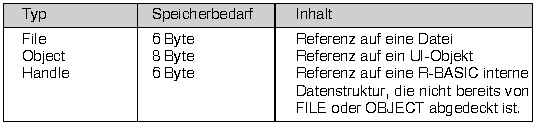 NullFileNullFile( ) ist eine Funktion, die eine "leere" Dateivariable liefert, d.h. sie dient zum Löschen einer Filevariablen. Achtung! NullFile( ) überschreibt die Referenz in der Filevariablen mit Nullen, ohne die Datei zu schließen! Das muss vorher passiert sein.Syntax: <fVar> = NullFile( ) Die Klammern sind erforderlich, weil NullFile eine Funktion ist. <fVar>: Variable vom Typ FILE Hinweise:Es ist nicht zwingend erforderlich, eine freigegebene Dateivariable auch mit NullFile( ) zu löschen. R-BASIC kann jedoch eine gelöschte Filevariable erkennen und so eventuell einen Systemabsturz verhindern.FileInfo$Die Funktion FileInfo$ liefert einen Text, der interne Informationen über eine Dateivariable liefert. Sie können diese Funktion zur Fehlersuche einsetzen.Syntax: <stringVar> = FileInfo$( <fileExpr> ) <fileExpr>: Variable oder Ausdruck vom Typ FILE <stringVar>: Stringvariable ^2.2.4.2 Der Datentyp HANDLEEin "Handle" ( = Anfasser) enthält eine Referenz auf eine Datenstruktur, deren Inhalt von R-BASIC verwaltet wird. Wo die Daten abgelegt sind, wie sie intern organisiert sind usw. braucht den R-BASIC Programmierer nicht zu kümmern, er greift immer indirekt über das Handle auf die Daten zu.