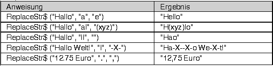 ReplaceStr$Die Funktion ReplaceStr$(s$, a$, b$) ersetzt jedes Auftreten des Strings a$ in s$ durch b$.Syntax: <stringVar> = ReplaceStr$(s$, a$, b$) <stringVar>: Stringvariable s$: String, der durchsucht werden soll a$: String, der ersetzt werden soll b$: String, der a$ ersetzen soll b$ darf genauso lang, länger oder kürzer als a$ sein. Ist b$ ein Leerstring, wird jedes Auftreten von a$ gelösch Beispiele: