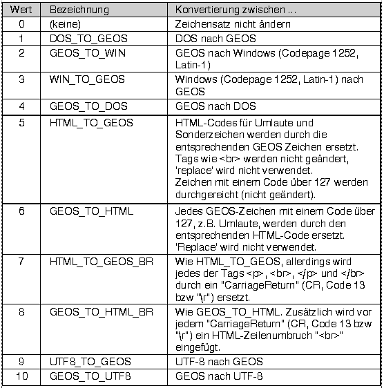 Zeichensätze konvertierenConvert$GEOS verwendet einen anderen Zeichensatz als DOS oder Windows, d.h. die ASCII-Codes für bestimmte Zeichen ( ASCII-Code >= 128) unterscheiden sich und es gibt Zeichen in jedem Zeichensatz, die in den anderen Zeichensätzen nicht darstellbar sind. Die Funktion Convert$() übernimmt die Konvertierung zwischen den verschiedenen Zeichensätzen und ersetzt Codes, die im neuen Zeichensatz nicht darstellbar sind.