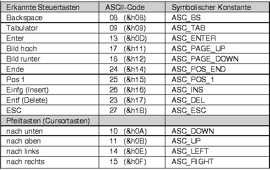 InKey$Die Funktion InKey$ (Input Keyboard = Tastatureingabe) liest ein einzelnes ASCII-Zeichen von der Tastatur ein. Bestimmte Steuerzeichen werden ebenfalls erkannt. InKey$ liefert einen Leerstring, wenn keine Taste gedrückt ist oder die Taste bereits abgefragt wurde.Syntax: <stringVar> = InKey$ Die in der Tabelle aufgeführten symbolischen Konstanten stehen zur Verfügung, wenn die KeyCodes-Library eingebunden wird (siehe 2. Beispiel).