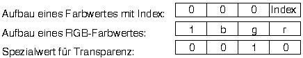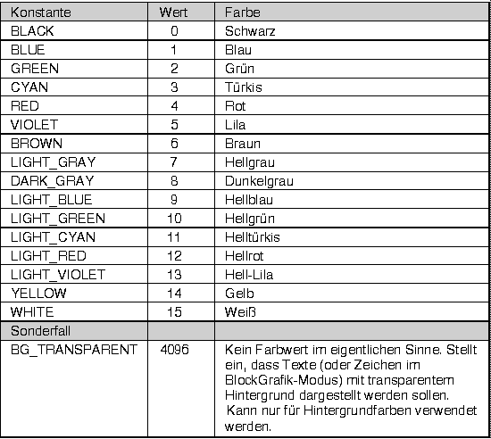 Hinweis: Um Texte oder Blockgrafik-Zeichen transparent auszugeben (d.h. der Hintergrund wird nicht gelöscht) verwenden Sie als Hintergrundfarbe den Wert BG_TRANSPARENT (=4096).