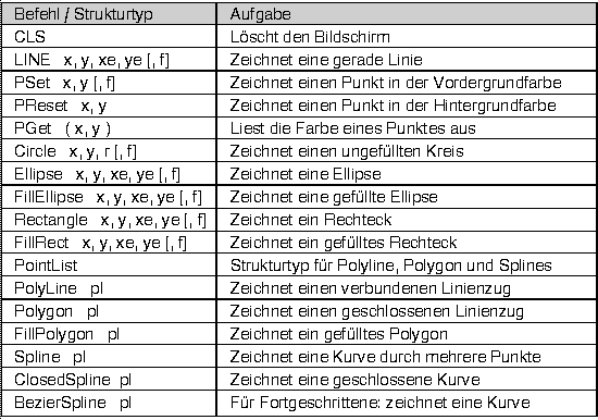 ^2.8.3 Linien, Punkte und FigurenDie folgende Tabelle gibt eine Übersicht über die in R-BASIC verfügbaren Grafikbefehle Linien, Punkten und Figuren.