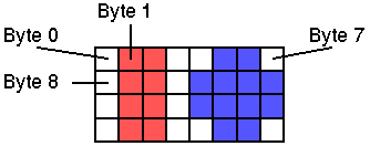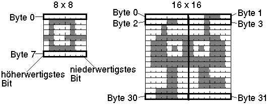 Das im Bild oben dargestellte Zeichen der Größe 8x4 Pixel wird durch folgende Bytes beschrieben (Rot: 12, Blau: 9, transparent: 255): 255, 12, 12, 255, 255, 9, 9, 255 Monochrome ZeichenIn diesem Modus besteht jedes Zeichen aus einer kleinen Monochrom-Grafik. Dabei kann jedes Pixel die Vordergrund- oder die Hintergrundfarbe annehmen. Für ein 8x8 Zeichen benötigt man 8 Byte, für ein 16x16 Zeichen bereits 32 Byte. Die Zählung der Bytes beginnt immer bei Null und erfolgt zeilenweise, d.h. zuerst von links nach rechts.