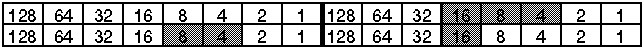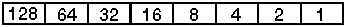 Den zu einem Byte gehörenden Zahlenwert erhält man, wenn man die gesetzten Bits (in der oberen Darstellung grau) entsprechend folgender Zuordnung addiert: